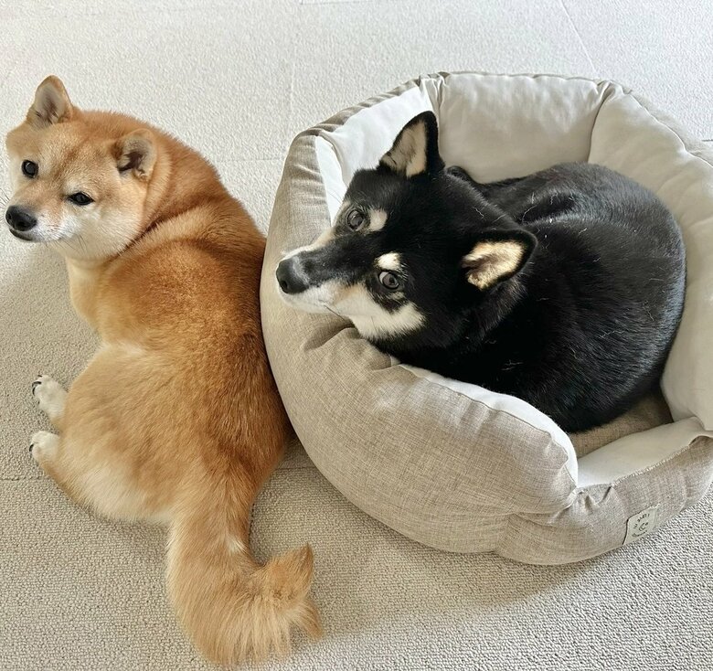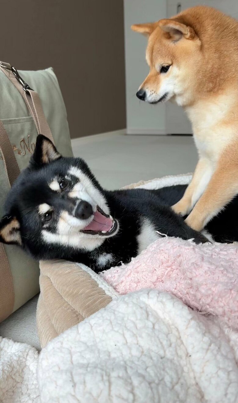 奇跡の1枚?黒柴“台風”を“片手”で止めに行く赤柴が強い……