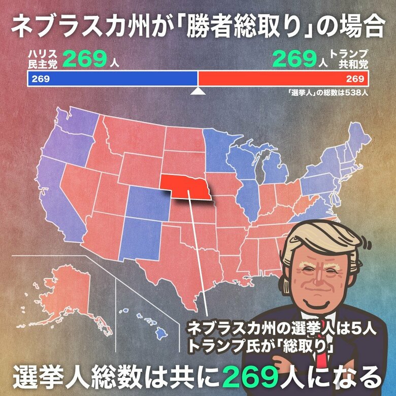 “ネブラスカ州オマハの選挙人”めぐりトランプ・ハリス両陣営… ギャラリー 1/4 記事に戻る トランプ陣営は「勝者総取り」になるようネブラスカ州の州法改正を画策 2/4 記事に戻る 現在の情勢では、選挙人総数でみるとハリス氏が優勢 3/4 記事に戻る 4/4 記事に戻る