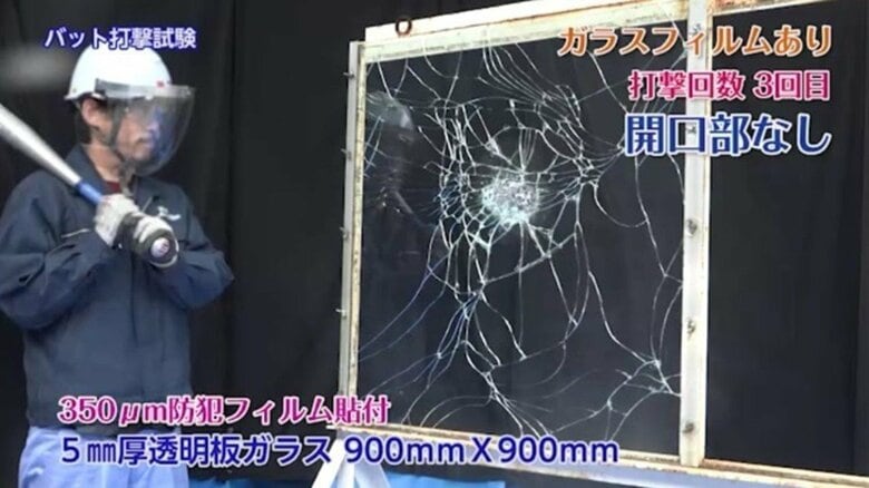 防犯フィルムの“セルフ貼り”は効果激減!ダメな貼り方の実例… ギャラリー 1/7 記事に戻る 日本ウインドウ・フィルム工業会 鳥養崇事務局長 2/7 記事に戻る (画像:日本ウインドウ・フィルム工業会提供) 3/7 記事に戻る 防犯フィルムの例 4/7 記事に戻る フィルム貼付のガラスは3回の打撃でも穴が開かず(画像:日本ウインドウ・フィルム工業会提供) 5/7 記事に戻る フィルムを貼る際はプロに相談を(画像はイメージ) 6/7 記事に戻る 防犯フィルムのCPマーク 7/7 記事に戻る