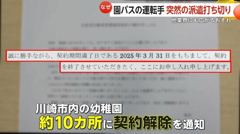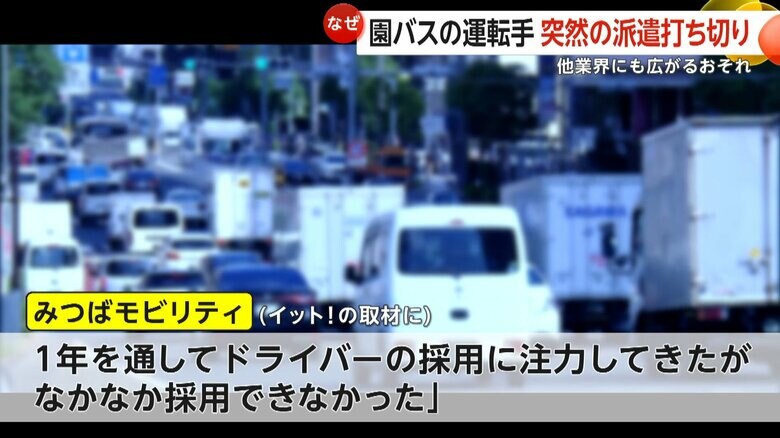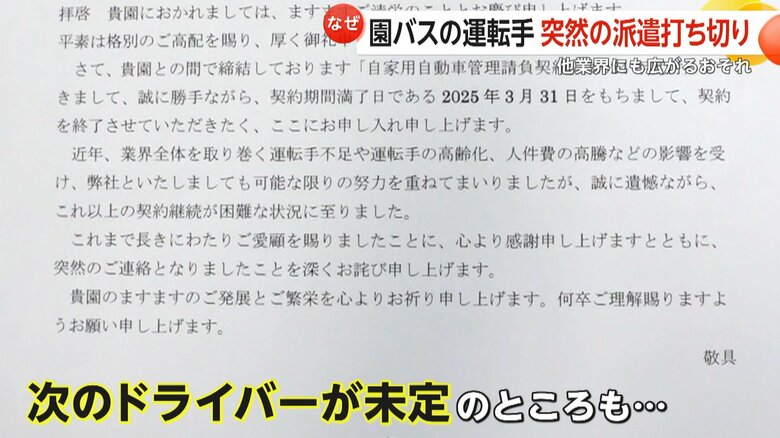 「2024年問題」で人材の“奪い合い”…園バスの運転手“突然の… ギャラリー 1/11 記事に戻る 2/11 記事に戻る 3/11 記事に戻る 4/11 記事に戻る 5/11 記事に戻る 6/11 記事に戻る 東京都内の業界大手「みつばモビリティ」が出したドライバーの派遣打ち切りに関する通知 7/11 記事に戻る 25年以上に渡って契約してきた浅田幼稚園 8/11 記事に戻る 「ちょっと憤りを感じました」と話す浅田幼稚園・三輪哲也園長 9/11 記事に戻る 「人材不足で、2026年度の運行が難しくなった」と説明するみつばモビリティ 10/11 記事に戻る 11枚目以降の画像を見る 1 2