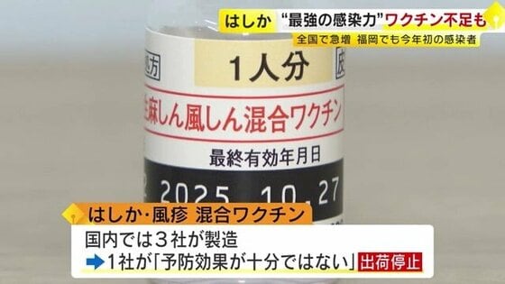 全国で急増「はしか」患者…3年ぶり確認 医療機関はワクチン… ギャラリー 1/8 記事に戻る 「はしか」感染者が急増もワクチン不足 2/8 記事に戻る 福岡で今年初の「はしか」感染者発表 3/8 記事に戻る 出典:国立感染症研究所 4/8 記事に戻る 「はしか」の感染経路は… 5/8 記事に戻る しんどう小児科 進藤静生院長 6/8 記事に戻る 街の人 7/8 記事に戻る せき小児科・アレルギー科クリニック 関真人院長 8/8 記事に戻る