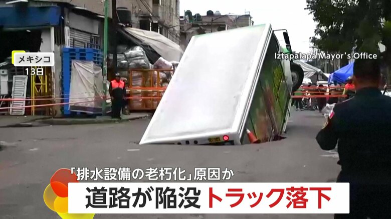 トラックが陥没した道路に落下の瞬間「排水設備の老朽化が原因… ギャラリー 1/11 記事に戻る 穴に後ろから落下していくトラック(Iztapalapa Mayor’s Office) 2/11 記事に戻る 現場を視察していた市長(Iztapalapa Mayor’s Office) 3/11 記事に戻る トラックが大きな音を立て、穴の中に落下する瞬間(13日、メキシコ・メキシコシティ)① 4/11 記事に戻る トラックが大きな音を立て、穴の中に落下する瞬間(13日、メキシコ・メキシコシティ)② 5/11 記事に戻る トラックが大きな音を立て、穴の中に落下する瞬間(13日、メキシコ・メキシコシティ)③ 6/11 記事に戻る トラックが大きな音を立て、穴の中に落下する瞬間(13日、メキシコ・メキシコシティ)④ 7/11 記事に戻る トラックが大きな音を立て、穴の中に落下する瞬間(13日、メキシコ・メキシコシティ)⑤ 8/11 記事に戻る 配送業務中だったというトラック 9/11 記事に戻る 荷台の扉は開き、中から積んでいた飲み物が次々とこぼれ落ちているトラック 10/11 記事に戻る 11枚目以降の画像を見る 1 2