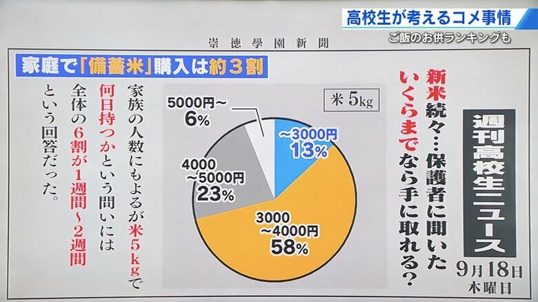 “新米”いくらなら買う? 7割の家庭が「4000円以上」に抵抗感… ギャラリー 1/5 記事に戻る 2/5 記事に戻る 「朝食でご飯を食べる頻度」半数が週3日以下 3/5 記事に戻る 生徒の保護者に「新米、いくらまでなら買う?」 4/5 記事に戻る 崇徳高校2年・神田喜心さん。趣味は映像編集でCGに挑戦中 5/5 記事に戻る