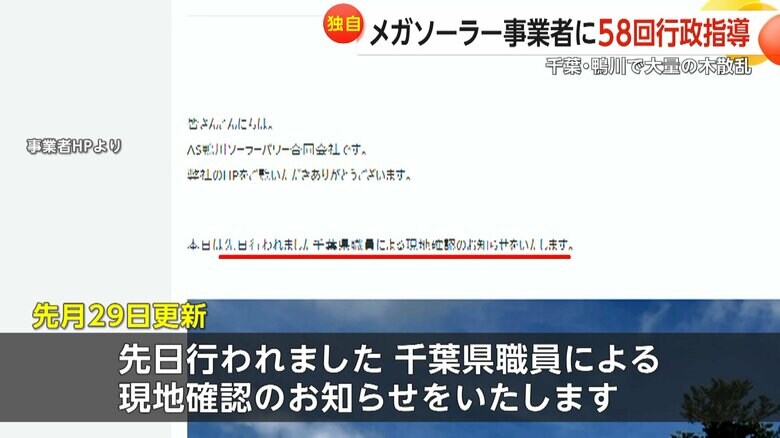 「土砂崩れで流れ出たら…」東京ドーム32個分のメガソーラー開… ギャラリー 1/11 記事に戻る 2/11 記事に戻る 3/11 記事に戻る 4/11 記事に戻る 5/11 記事に戻る 6/11 記事に戻る 大規模な太陽光発電施設「メガソーラー」の開発計画(千葉・鴨川市) 7/11 記事に戻る 現在事業者が計画の見直しを進めていると回答した千葉県 8/11 記事に戻る 人の気配がない県から指導を受けた事業者の建物 9/11 記事に戻る 粘着テープで張り紙が貼ってあった県から指導を受けた事業者の玄関 10/11 記事に戻る 11枚目以降の画像を見る 1 2