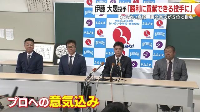 れいめい高校・伊藤大晟投手「勝利に貢献できる投手に」 東北… ギャラリー 1/4 記事に戻る 2/4 記事に戻る 引き締まった表情でプロ入りの意気込みを語った伊藤投手 3/4 記事に戻る 4/4 記事に戻る
