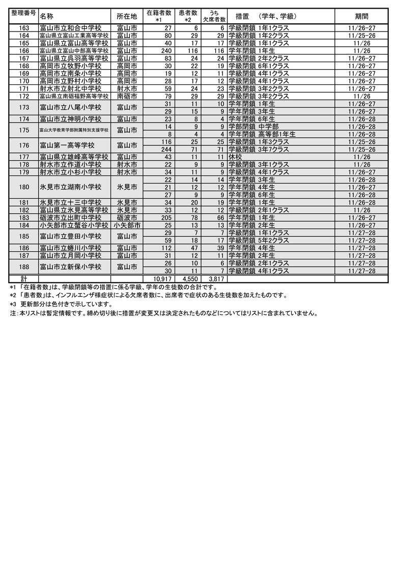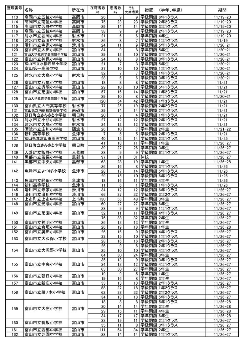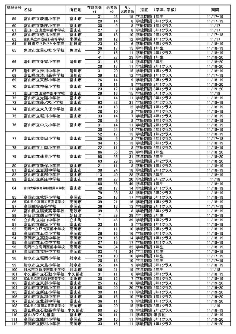 インフルエンザ早期流行の原因は「サブクレードK」変異株 全… ギャラリー 1/8 記事に戻る 2/8 記事に戻る 今季のインフルエンザによる学級閉鎖等の状況 表の一番右が措置の期間(出典:富山県) 3/8 記事に戻る 4/8 記事に戻る 5/8 記事に戻る 6/8 記事に戻る 7/8 記事に戻る 8/8 記事に戻る