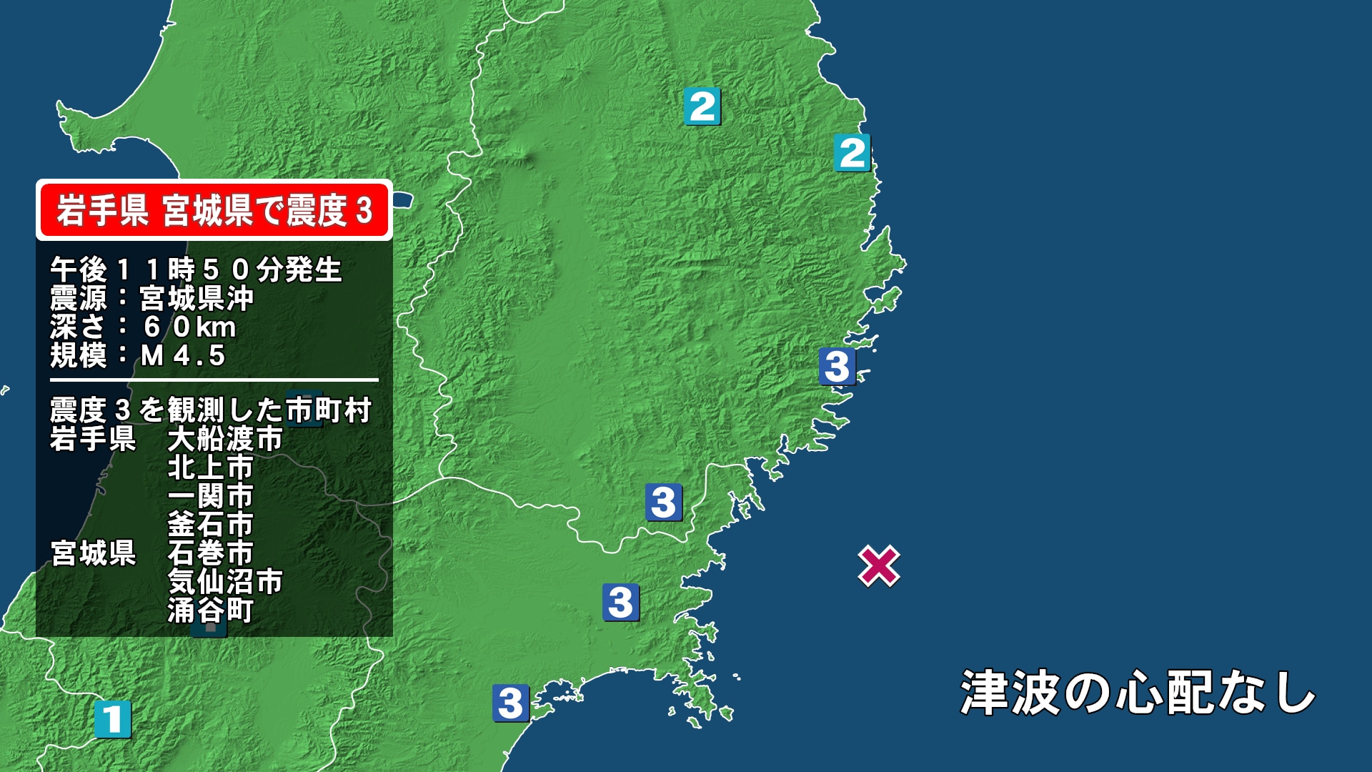 震源地 | 宮城県沖 |